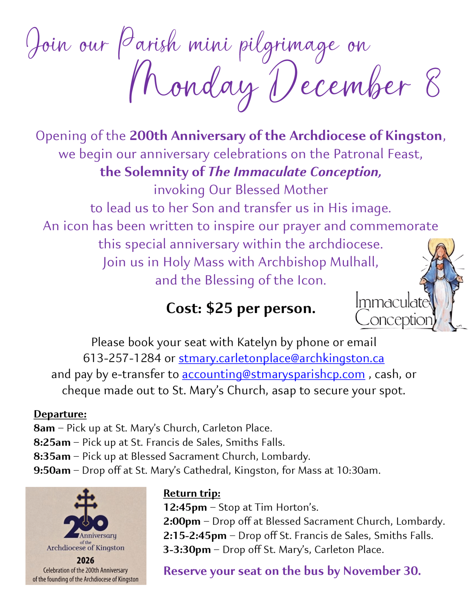 Due to limited interest, we will not charter a parish bus. St. Mary’s in Carleton Place invites our parishioners to join their coach ($25/person). Reserve with Katelyn: 613-257-1284 or stmary.carletonplace@archkingston.ca ...... see poster above.